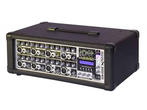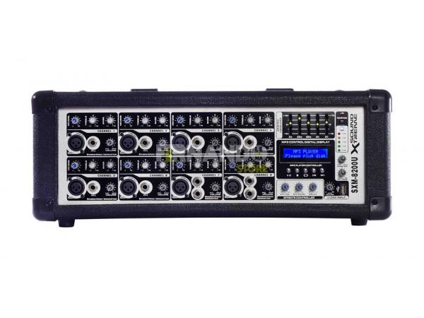 SOUND XTREME Mezclador amplificado 8 canales Entrada USB (con Reproductor MP3) Display LCD Potencia: 150W RMS 4 Ohms Ecualizacion por canal Reverberacion, graves, agudos y volumen por canal Control general de efectos volumen, eco, delay Fuente phantom +15v para entradas balanceadas Entrada auxiliar (con nivel independiente) y salida tape Alimentacion 220 VCA 50Hz
